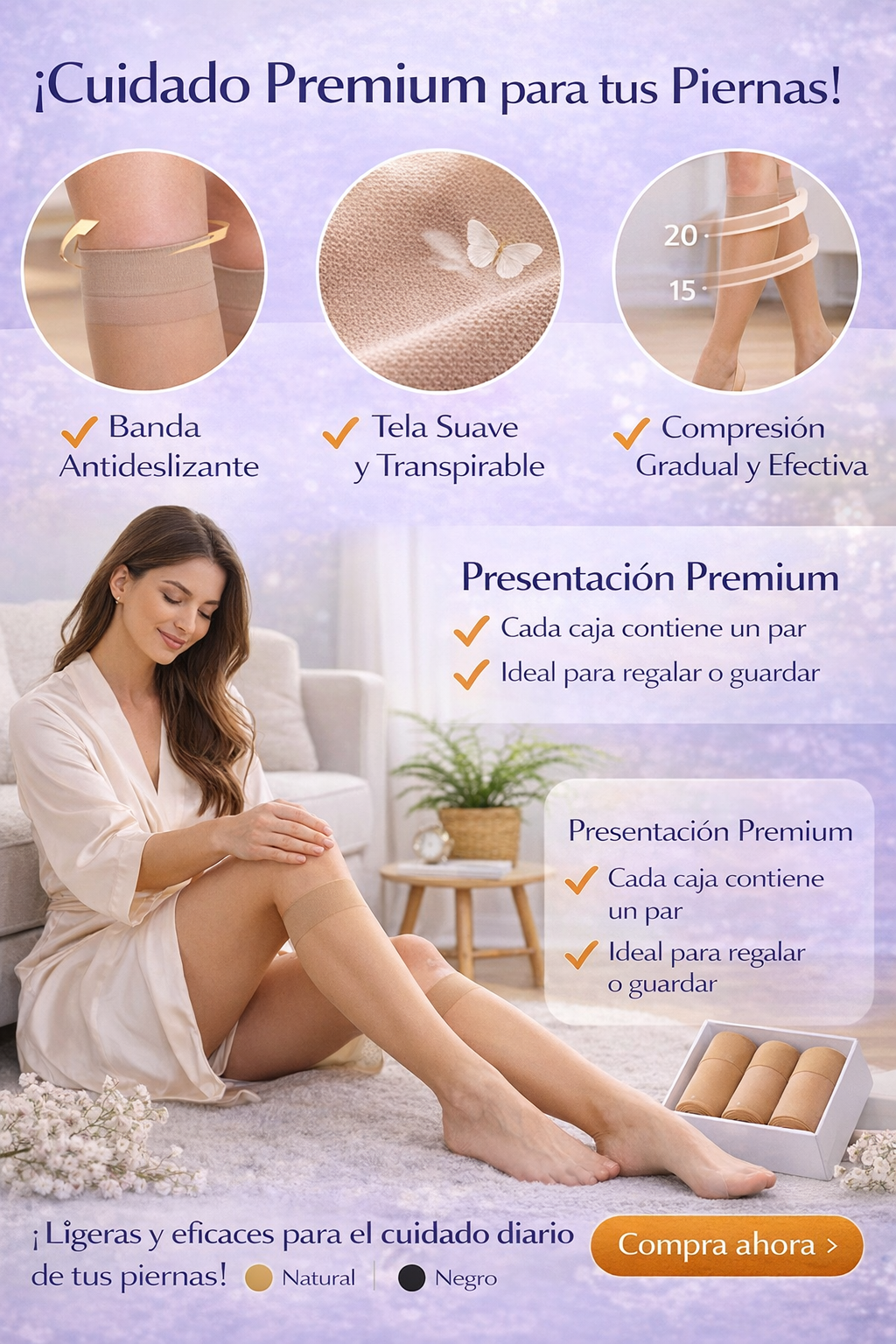 El diseño anatómico y elegante de estas medias se adapta a la forma de la pierna, ofreciendo un look discreto y profesional que combina muy bien con ropa laboral, casual o más formal. Están disponibles en color natural y negro, ideales para distintos tonos de piel y estilos.